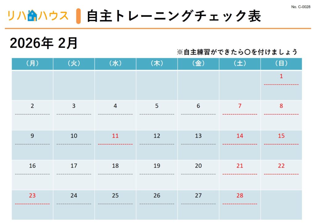 【無料ダウンロード】1ヵ月分の自主トレチェック表 2026年2月分|リハビリ指導に使える記録用シート