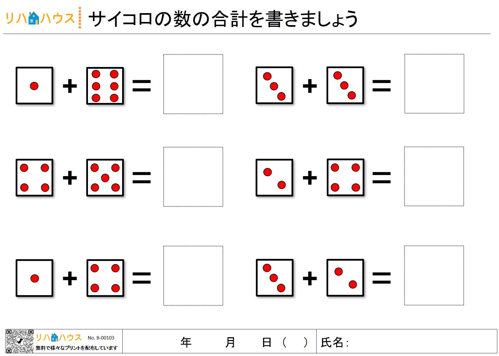 初級:サイコロの数を2個固定で、合計を答える形式(本プリント)。