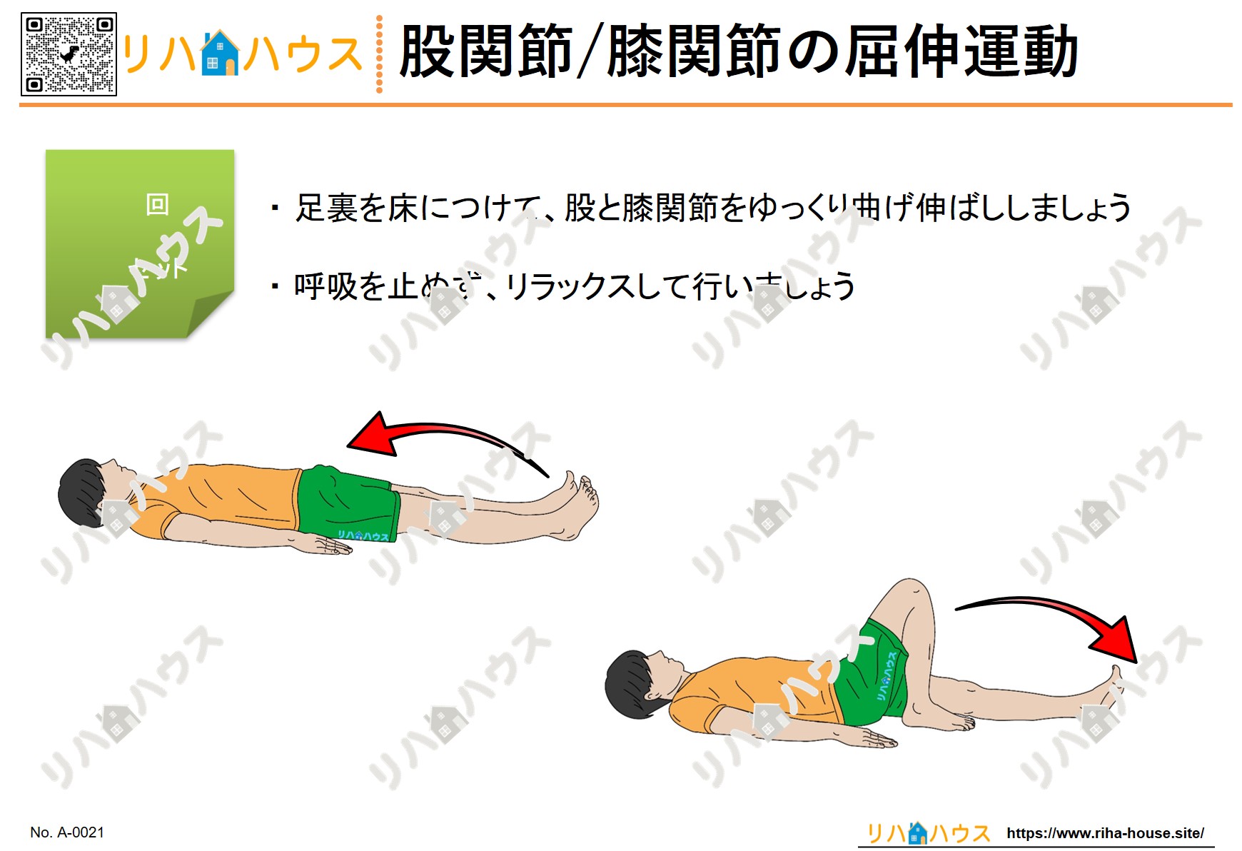 今回リハハウスでは、踵を床に付けたまま、片脚をゆっくり屈曲・伸展させる自主トレーニングをイラスト化した無料プリントを作成しました。動作の流れが視覚的に確認できるよう工夫しており、説明時の補助資料として、また在宅での自主トレーニングサポートとして活用しやすい構成になっています。