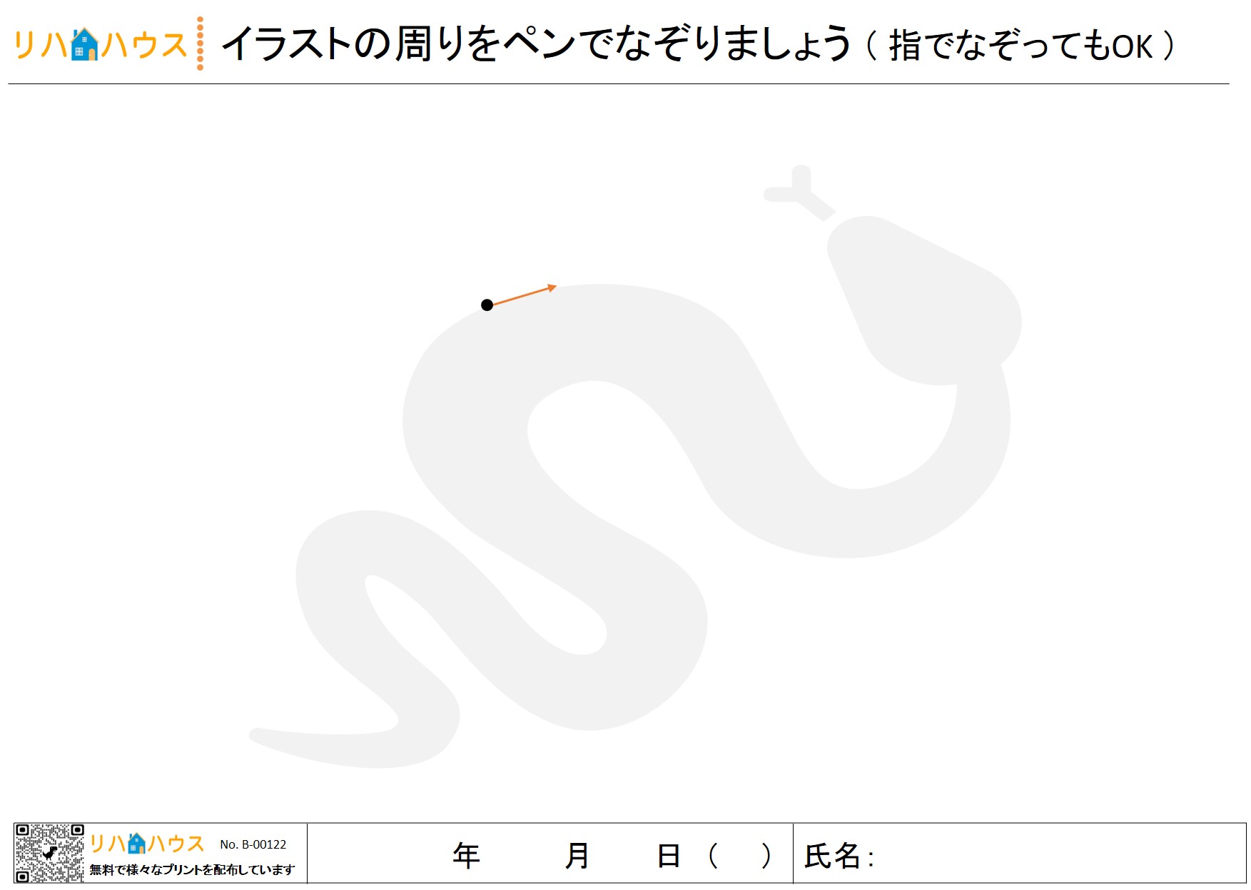 このプリントでは、紙面上に薄く描かれた大きめの簡単なイラスト(例:花・動物・日用品など)を使用します。対象者は、イラストの外周を右から左に向かってゆっくりとペンでなぞる、あるいは指先でなぞる動作を行います。