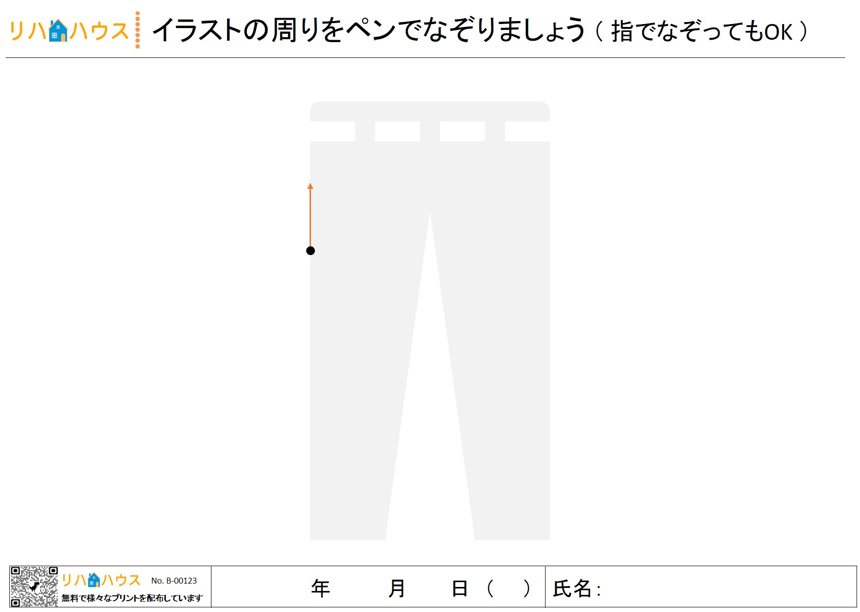 このプリントでは、紙面上に薄く描かれた大きめの簡単なイラスト(例:花・動物・日用品など)を使用します。対象者は、イラストの外周を右から左に向かってゆっくりとペンでなぞる、あるいは指先でなぞる動作を行います。