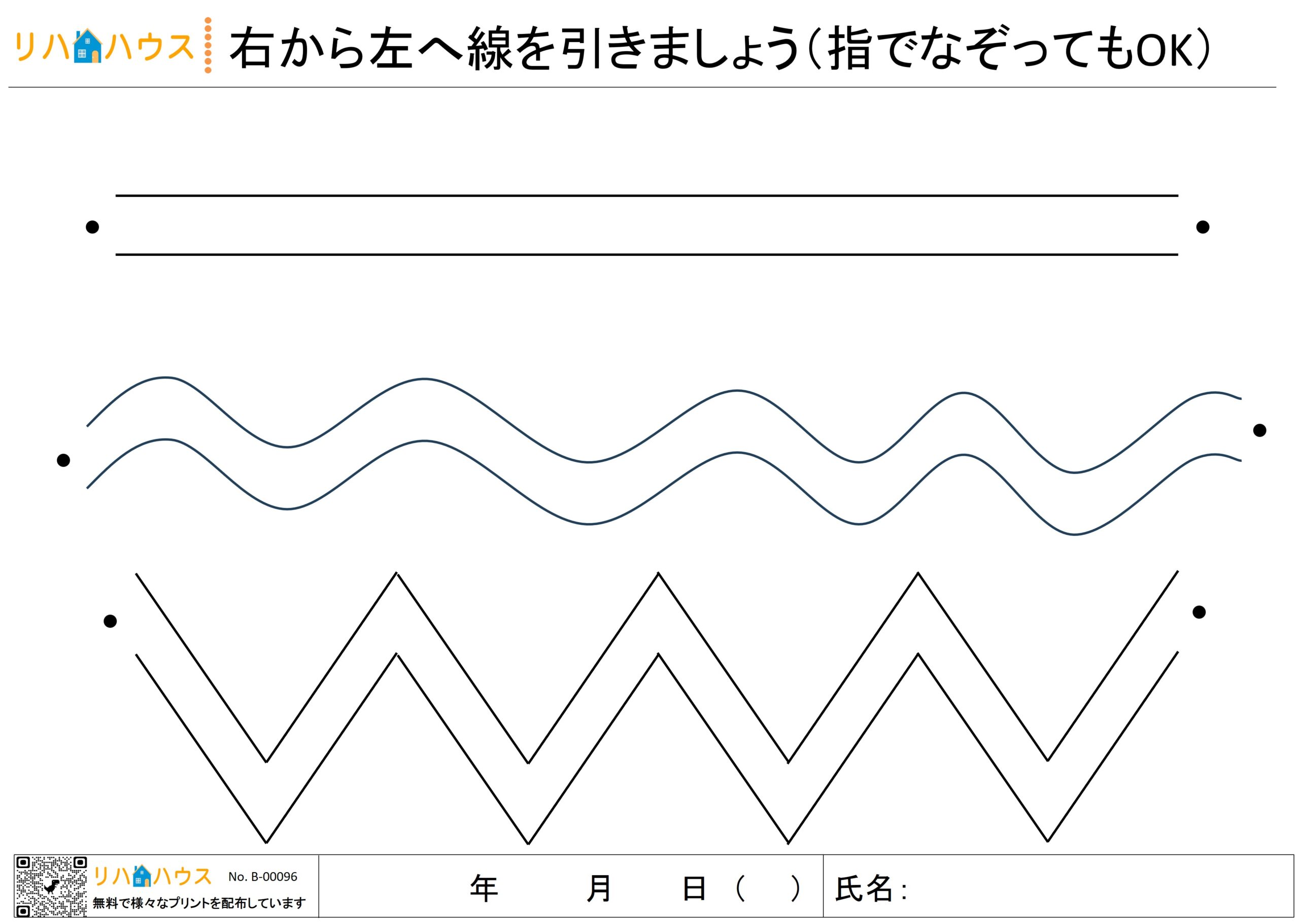 半側空間無視のある方は、右半球損傷により左空間への注意が低下しやすく、行動や視線が右側に偏る傾向があります。このプリントでは、スタート位置をあえて右側に設定し、線を左方向へ進めていく構成とすることで、自然に左空間への探索行動を促します。