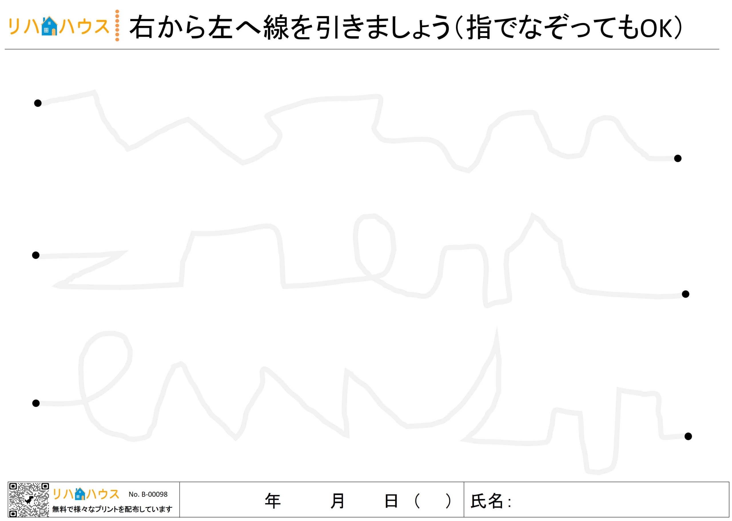 半側空間無視のある方は、右半球損傷により左空間への注意が低下しやすく、行動や視線が右側に偏る傾向があります。このプリントでは、スタート位置をあえて右側に設定し、線を左方向へ進めていく構成とすることで、自然に左空間への探索行動を促します。