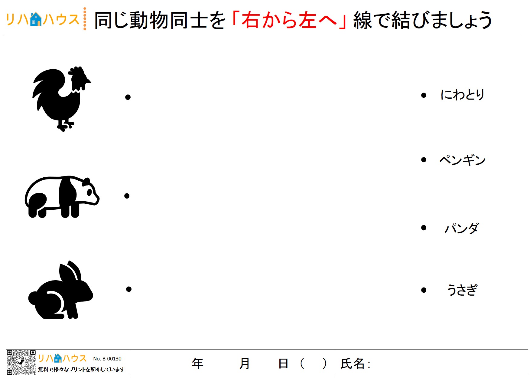 今回紹介するリハハウスの無料ダウンロードプリントは、右側に書かれた動物の名前と、左側に配置された動物のイラストを線で結ぶ「マッチング課題」です。右から左へ注意を移動させる構造になっており、半側空間無視の方が左側空間へ意識を向けるきっかけとして使用できる課題となっています。