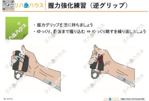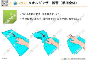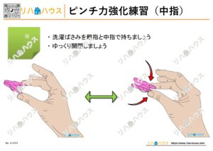 動作の方向性を視覚的に確認できるため、指の位置や動かし方を理解しやすい構成になっています。臨床現場での説明資料としても、自主トレーニングの補助としても活用できるシンプルなプリントです。