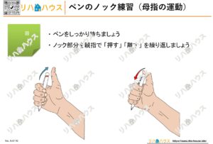 今回リハハウスでは、机の上に置いたおはじきを母指と示指でつまみ上げる練習ができる無料プリント素材を制作しました。示指を支点にし、母指でおはじきを押し上げてつまむという動作を、イラストでわかりやすく示しています。