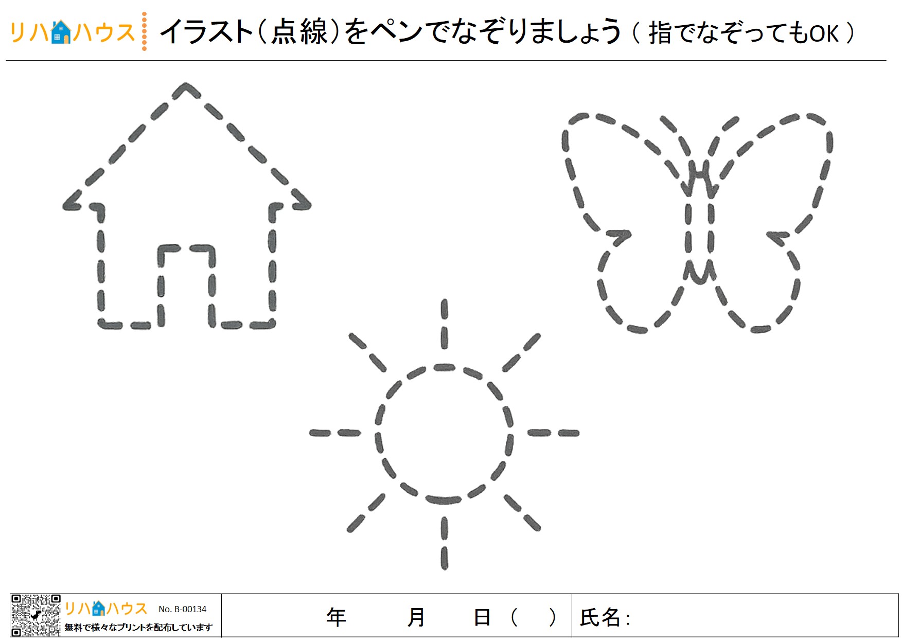 今回リハハウスで提供する書字トレーニングプリントは、「家」「蝶々」「太陽」をモチーフにしたなぞり書き課題です。薄いグレーで描かれた図形をペンでなぞるだけのシンプルな構成のため、書字動作の導入として非常に使いやすい教材となっています。