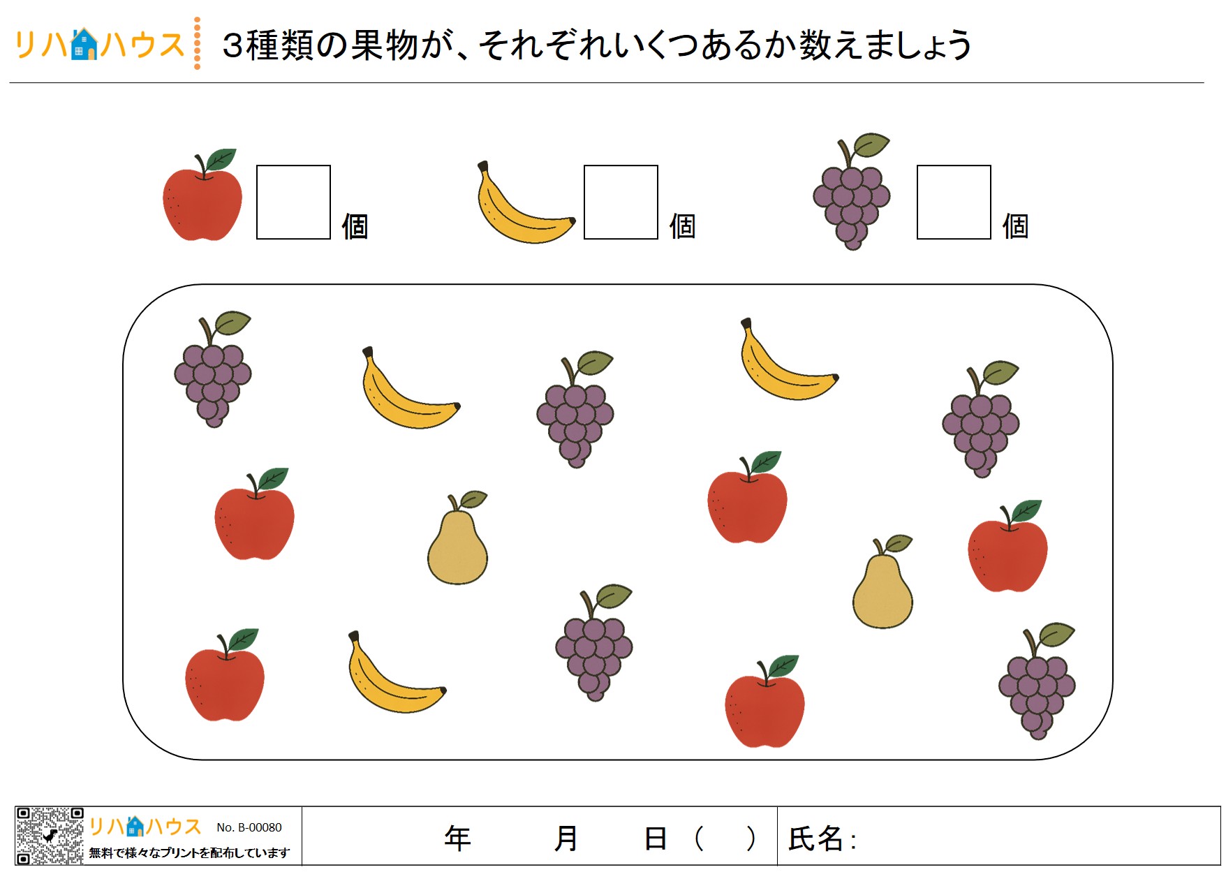 りんご、バナナ、ぶどうの3種類の果物が描かれており、それぞれの個数を数えて記入するというシンプルな構成になっています。