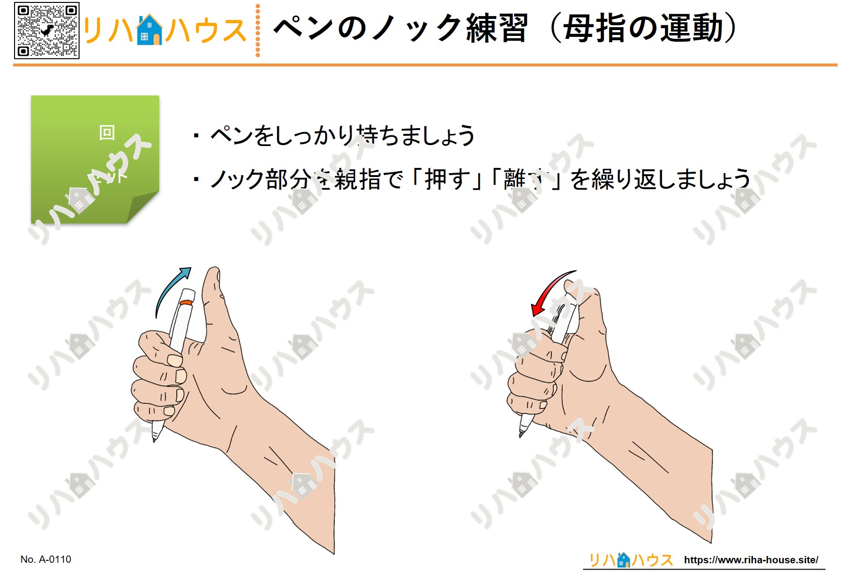 今回のプリントは、母指のみでボールペンのノック部分を押し込む動作に焦点を当てています。手にボールペンを持ち、示指・中指・環指・小指で軽く支えながら、母指でノック部分を押し下げるイラストを掲載しています。