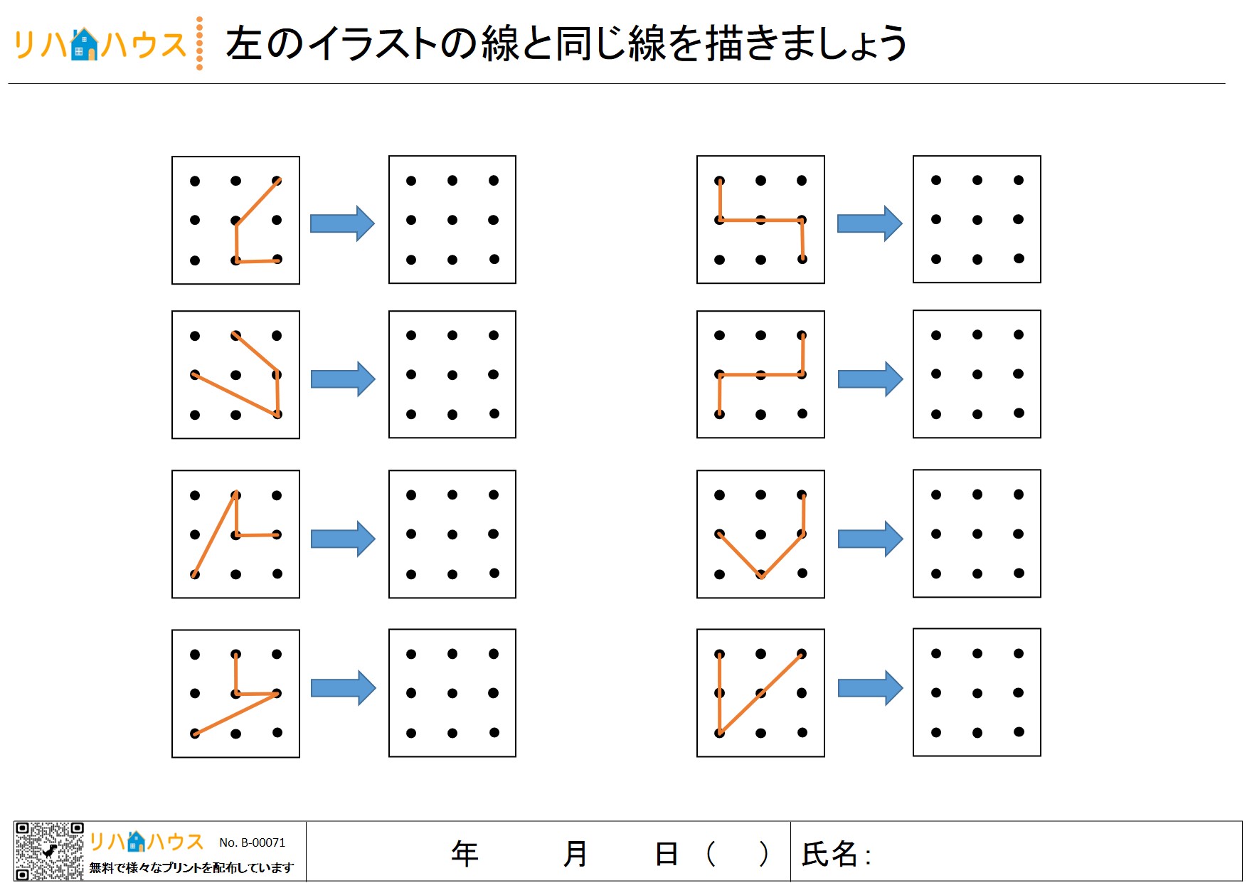 対象者にプリントを提示し、「左の図形と同じ形を右の点の上で再現してください」と口頭で説明します。ペンや鉛筆を使用し、線が見やすいようにします。