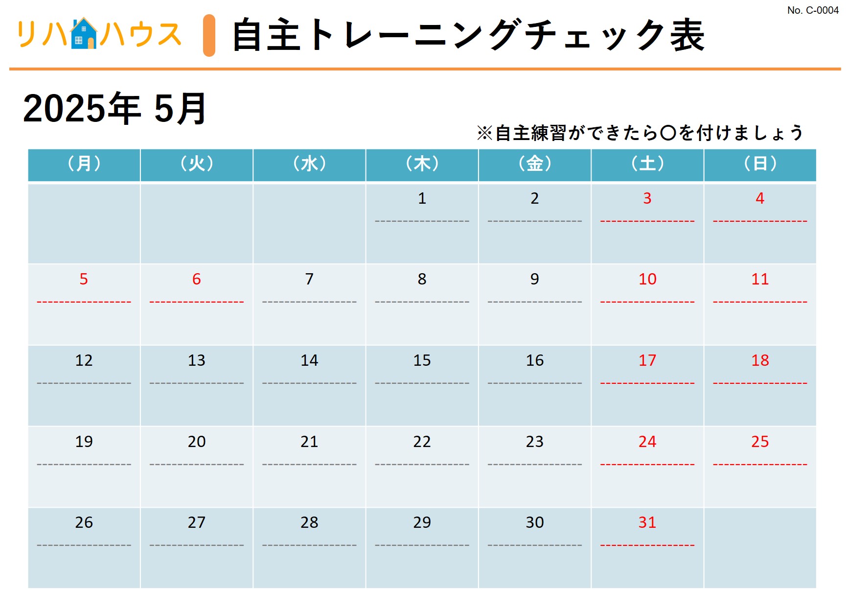 患者さんが、自主トレーニングに取り組んだ日をひと目で確認できるように設計されており、「続けること」、「達成を実感すること」、「振り返ること」を目的に作られた記録用ツールです。