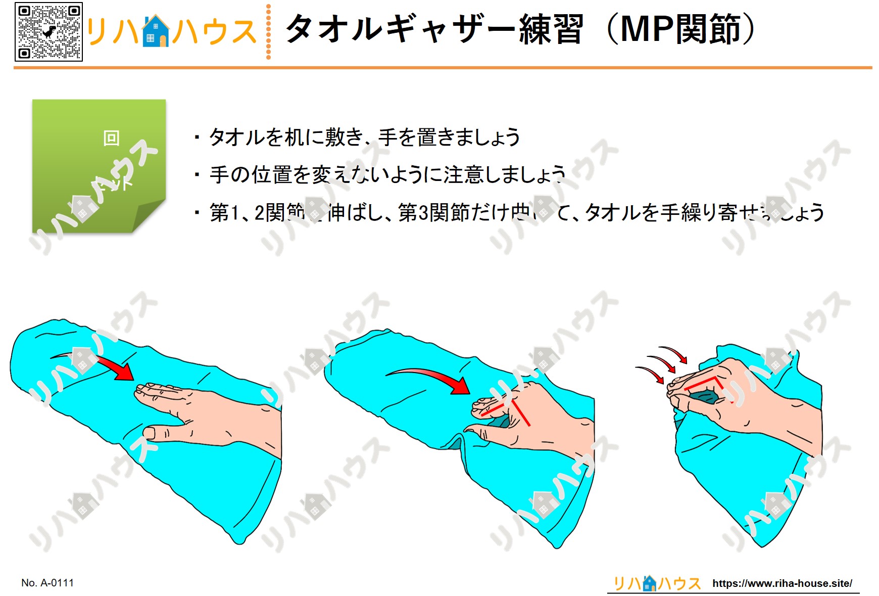 - MP関節のみを屈曲してタオルをたぐり寄せる