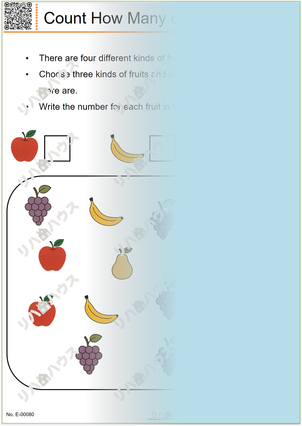 The task is to choose three types of fruits, carefully count how many of each fruit appear, and write the correct number in the spaces provided.