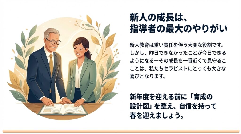 毎年春になると、多くの医療機関に新人セラピストが入職します。新人教育は職場の未来をつくる重要な取り組みであり、指導を任されたセラピストにとっても大きな責任を伴う役割です。