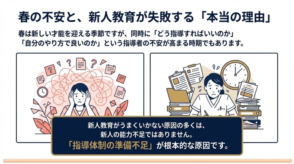 春は新しい人材が職場に加わる期待の季節ですが、同時に指導者側の不安も高まる時期です。