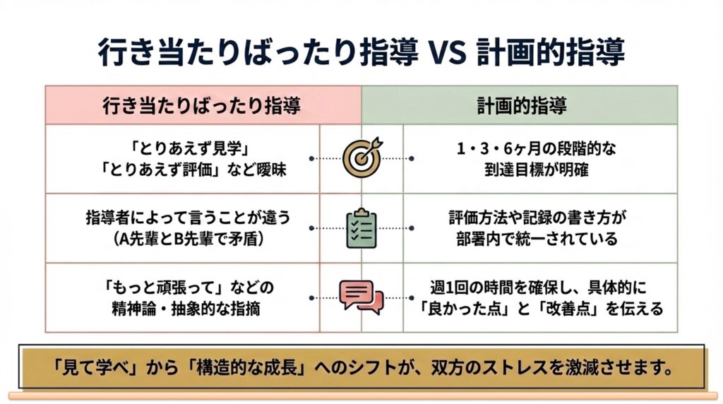 新人教育が失敗する典型的なパターンが、行き当たりばったりの指導です。