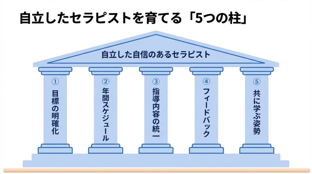 これらの柱が整うことで、新人は安心して成長できる環境の中で臨床経験を積むことができます。