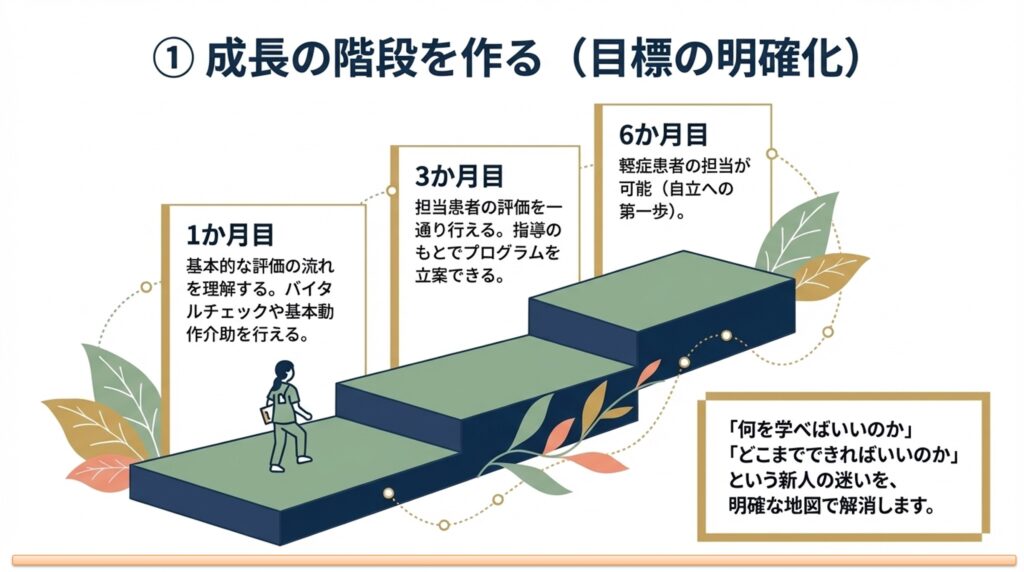 このような段階的な目標を設定することで、新人は「何を学べばよいのか」、「どこまでできればよいのか」を理解できるようになります。これは新人の不安を大きく軽減する効果があります。