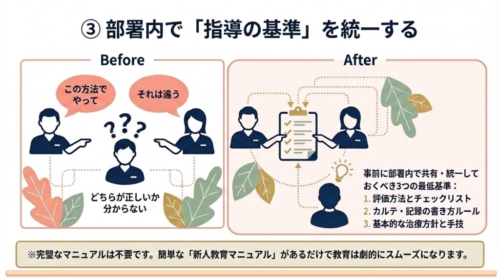 といった状況では、新人は「何を学べばよいのか」が分からず、不安を抱えたまま臨床に向き合うことになります。新人教育を成功させるためには、まず教育体制そのものを整えることが重要です。