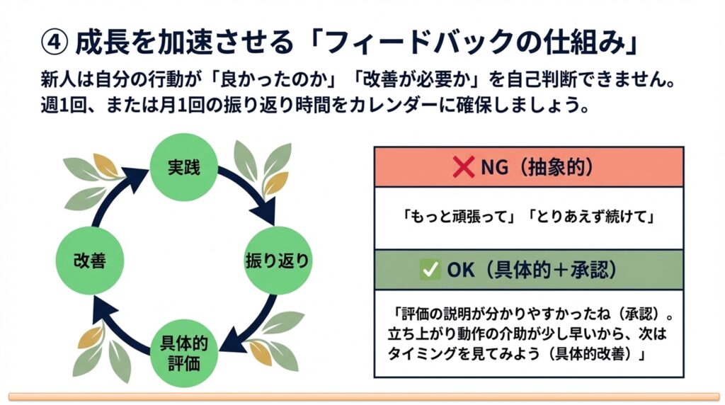 新人教育において、フィードバックは成長を加速させる重要な要素です。