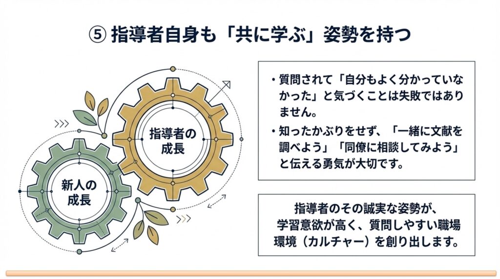 新人教育は、新人だけでなく指導者自身の成長の機会でもあります。