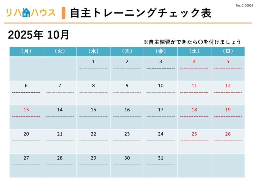 【無料ダウンロード】1ヵ月分の自主トレチェック表 2025年10月分|リハビリ指導に使える記録用シート