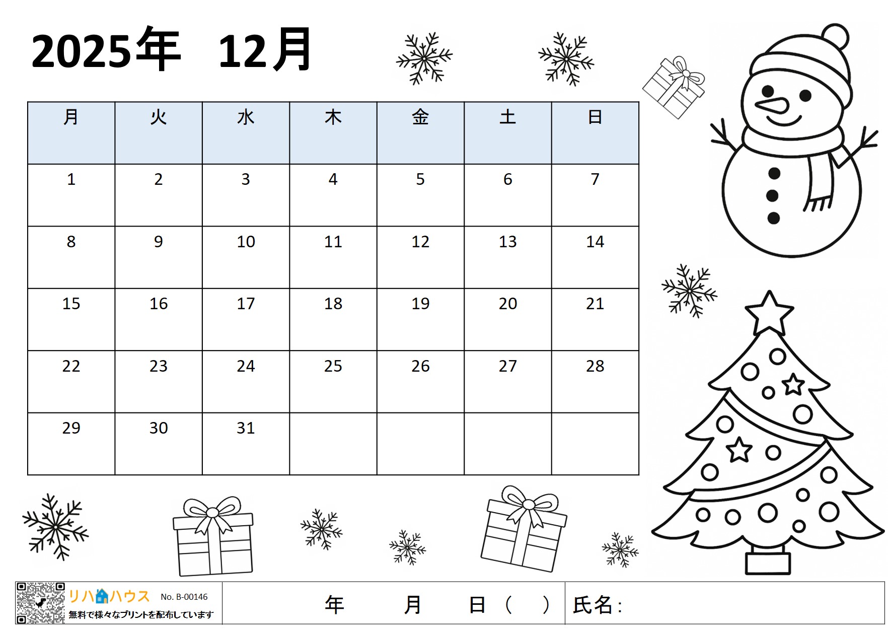 今回リハハウスで提供する【無料ダウンロード】プリントは、2025年12月のカレンダーと、周囲にシンプルな塗り絵イラストをデザインしたリハビリ教材です。