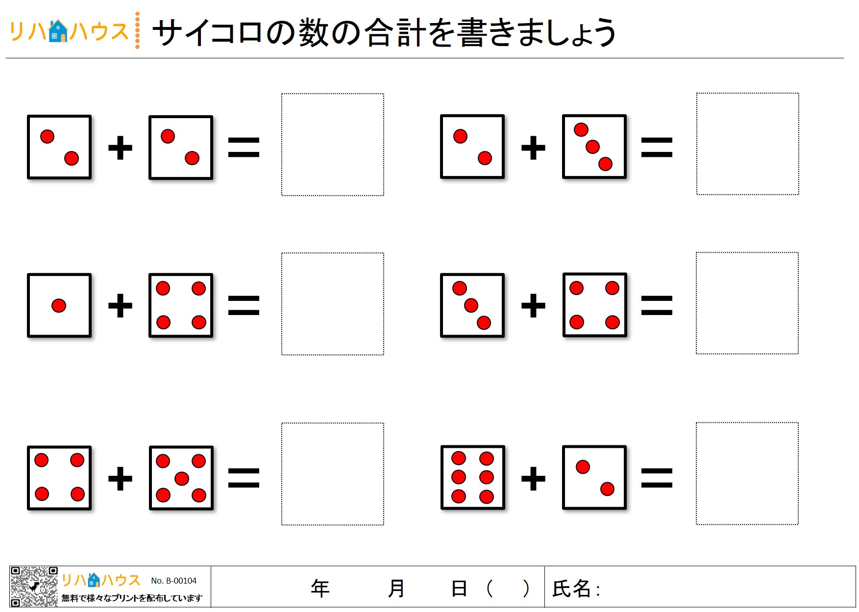 初級:サイコロの数を2個固定で、合計を答える形式(本プリント)。