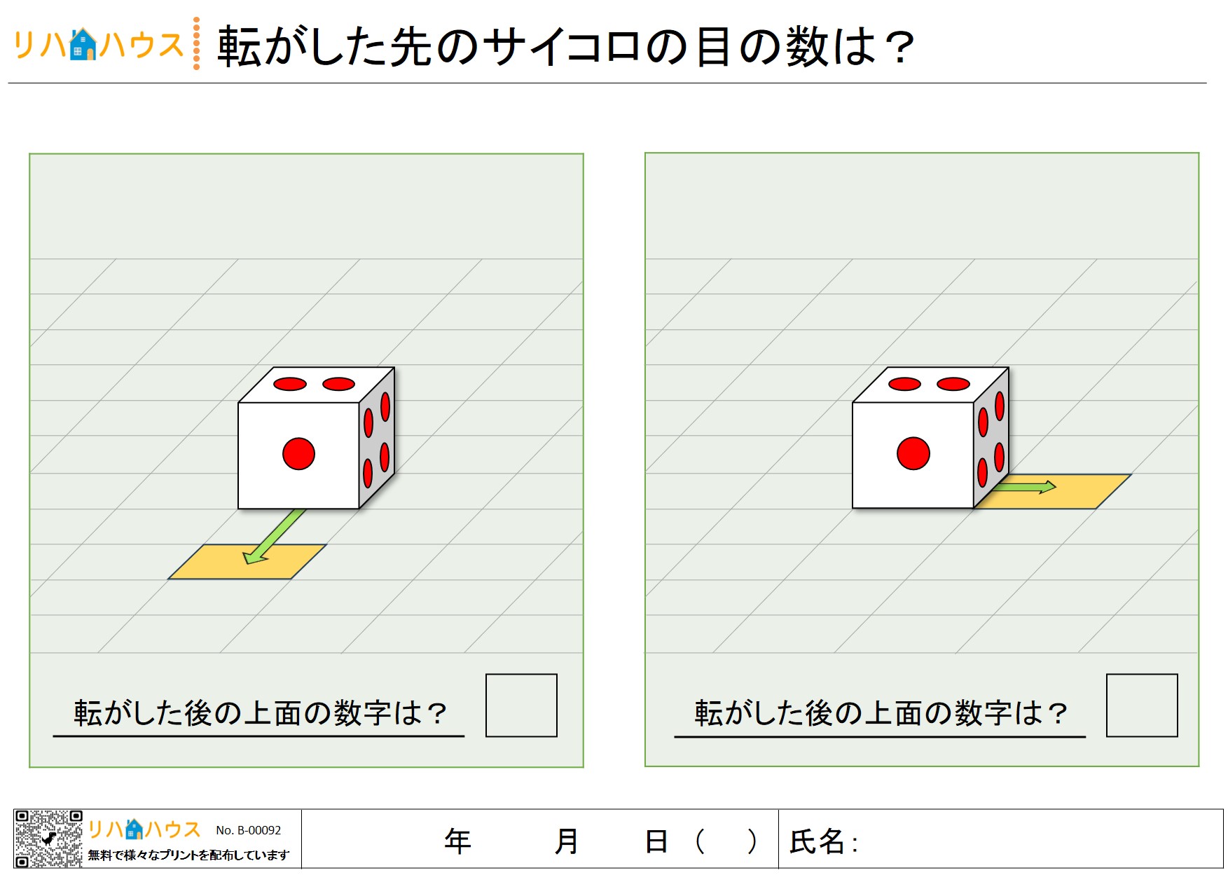 シンプルな構成ですが、頭の中でサイコロの回転をイメージする必要があるため、空間的把握力・ワーキングメモリ・論理的思考力のすべてを同時に鍛えることができます。臨床でも、自主トレでも効果的に活用できる課題です。