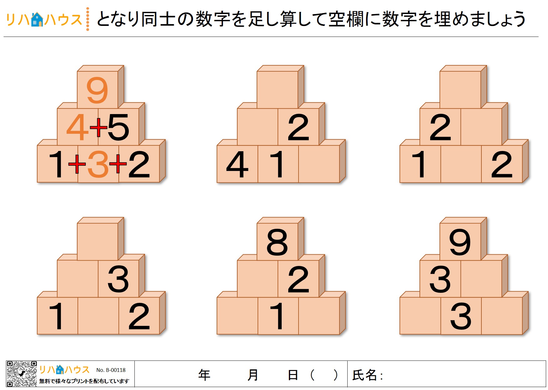「隣同士の数字を足すと上の段の数になる仕組みです」と伝え、最初に例題を一緒に確認します。