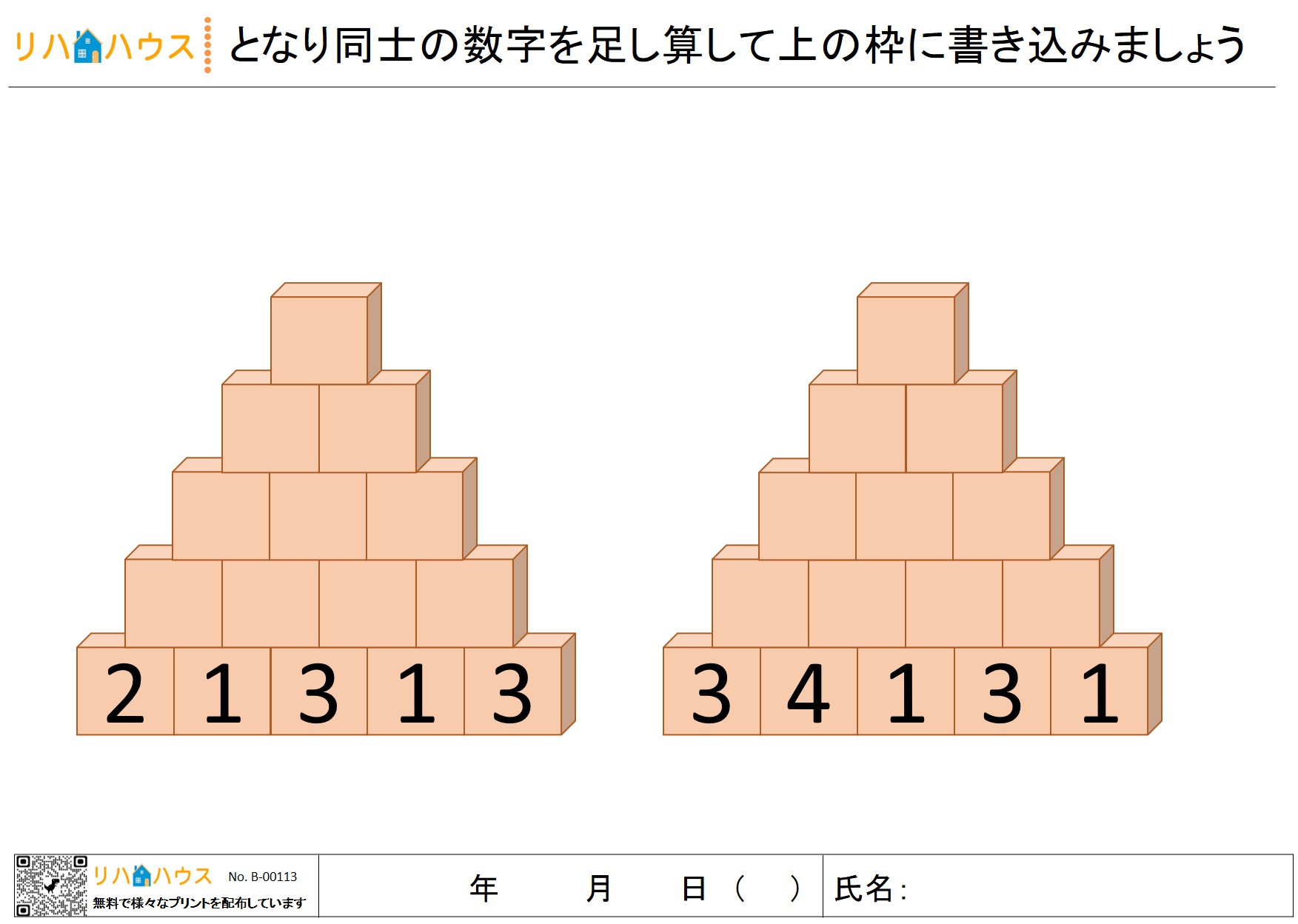 このプリントでは、5段構成のピラミッド型図形が2問用意されています。
