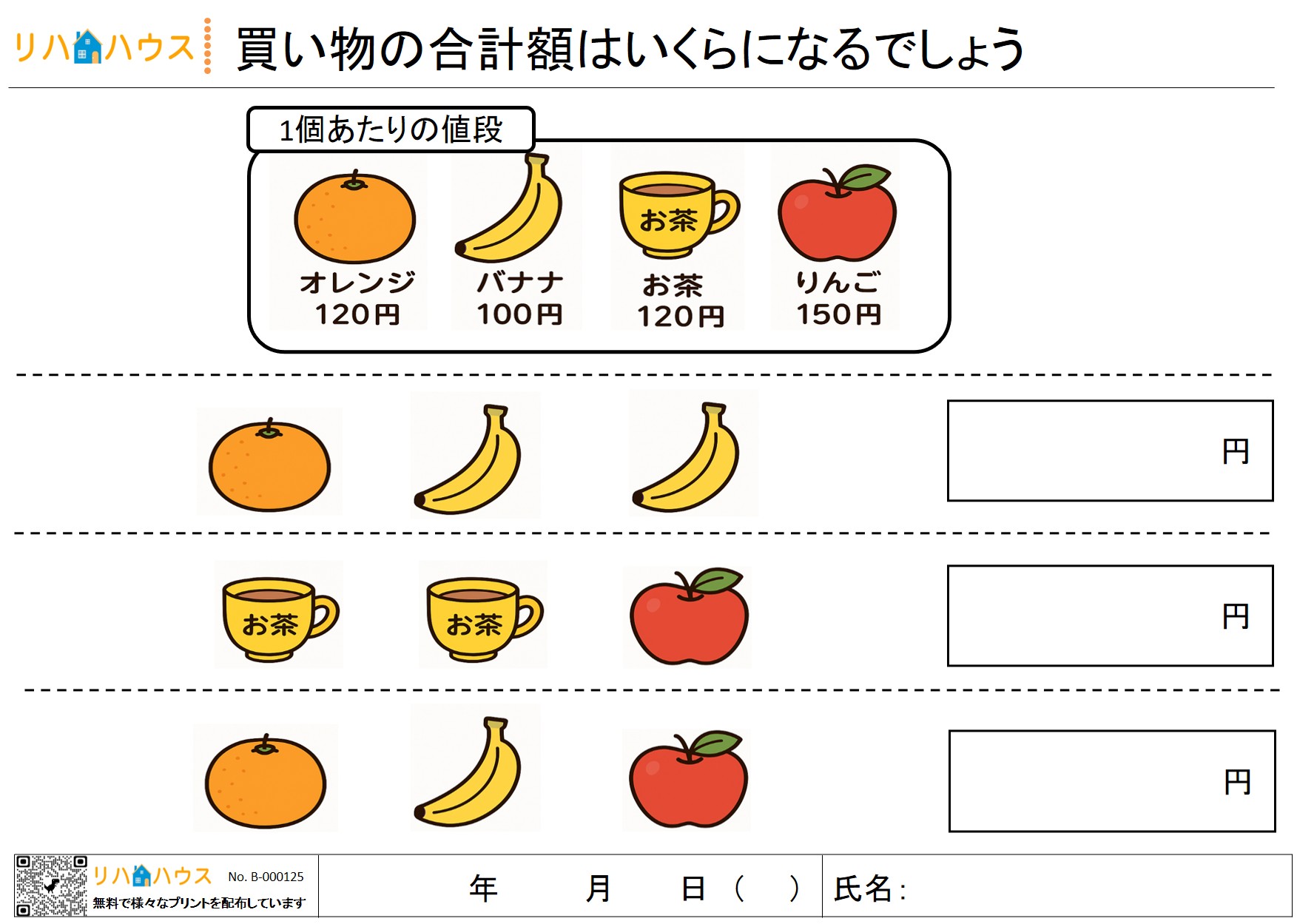 イラストはシンプルで視認性が高く、高齢者の方や注意障害をお持ちの方でも取り組みやすいデザインになっています。課題は「オレンジ120円・バナナ100円・お茶120円・りんご150円」といった4種類の価格設定をもとに、下部に提示された3つの組み合わせイラストの合計金額を計算する形式です。