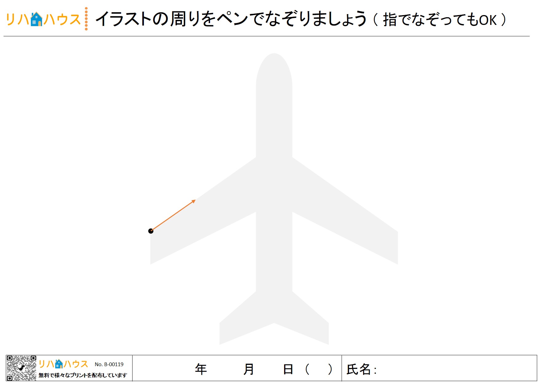 このプリントでは、紙面上に薄く描かれた大きめの簡単なイラスト(例:花・動物・日用品など)を使用します。対象者は、イラストの外周を右から左に向かってゆっくりとペンでなぞる、あるいは指先でなぞる動作を行います。