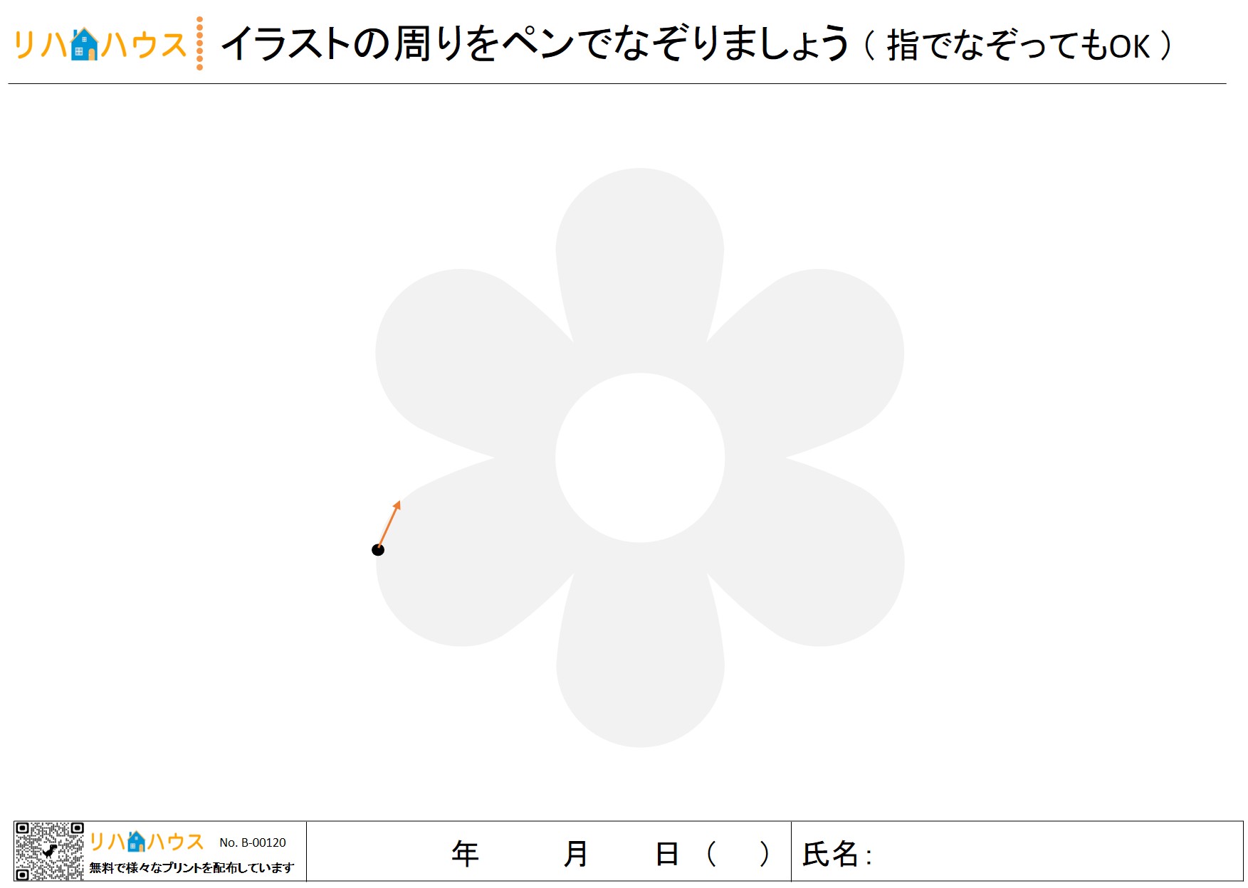 このプリントでは、紙面上に薄く描かれた大きめの簡単なイラスト(例:花・動物・日用品など)を使用します。対象者は、イラストの外周を右から左に向かってゆっくりとペンでなぞる、あるいは指先でなぞる動作を行います。