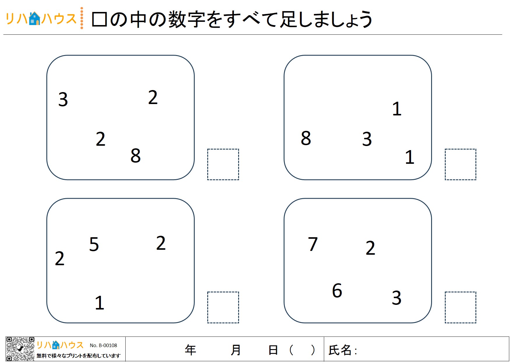 1枚のプリント内に、4つの大きな四角(□)があり、それぞれの中に1桁の数字が4つランダムに配置されています。対象者は、その数字をすべて足し合わせ、合計を記入します。