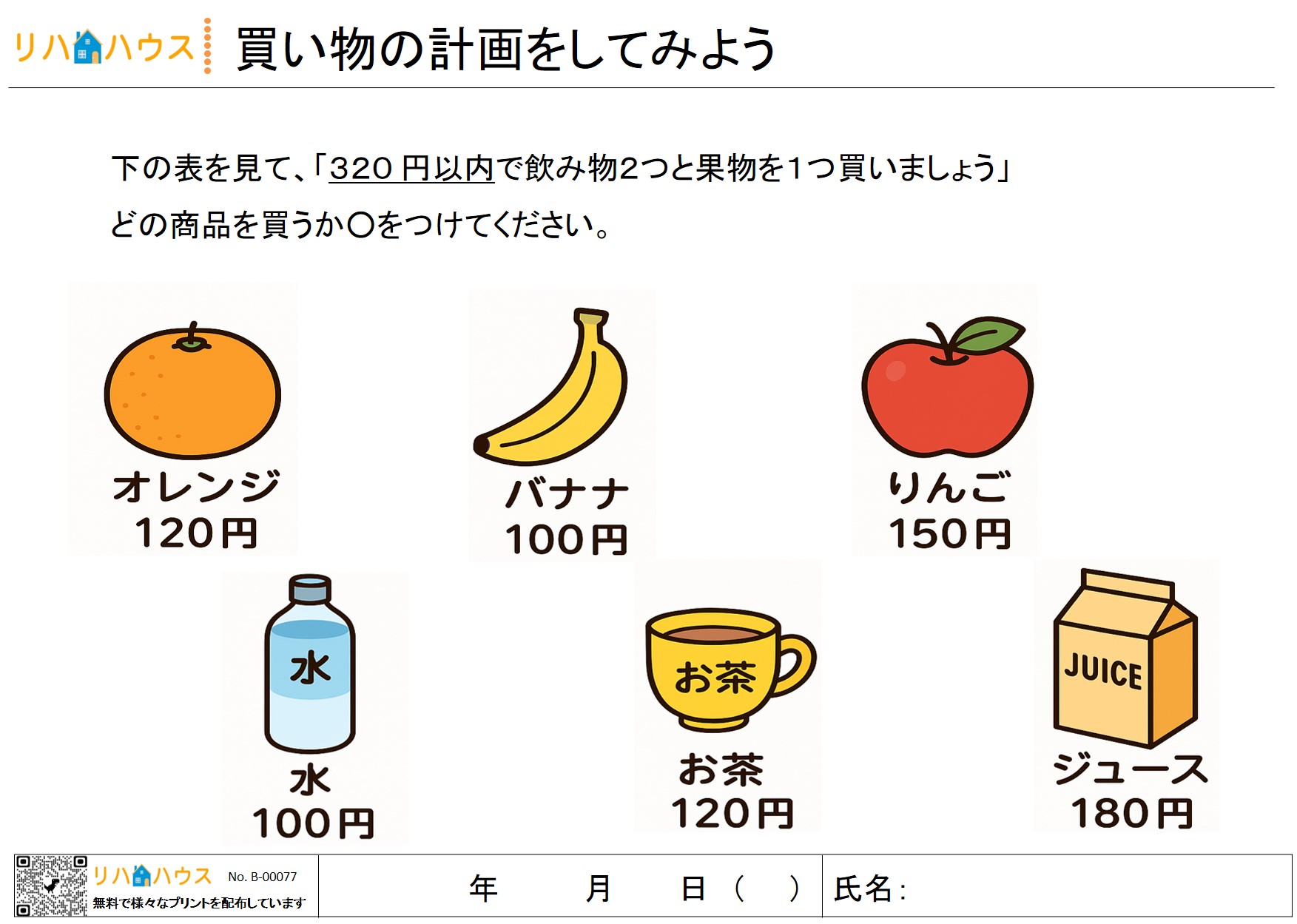 対象者にプリントを提示し、「この中から、指定された金額内で買えるものを選んで〇をつけましょう」と説明します。金額の上限(例:500円以内、700円以内など)は対象者のレベルに合わせて設定します。