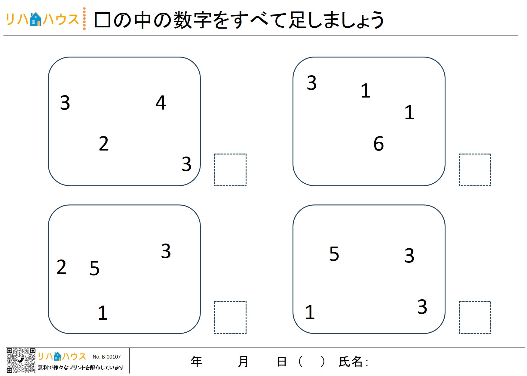 1枚のプリント内に、4つの大きな四角(□)があり、それぞれの中に1桁の数字が4つランダムに配置されています。対象者は、その数字をすべて足し合わせ、合計を記入します。